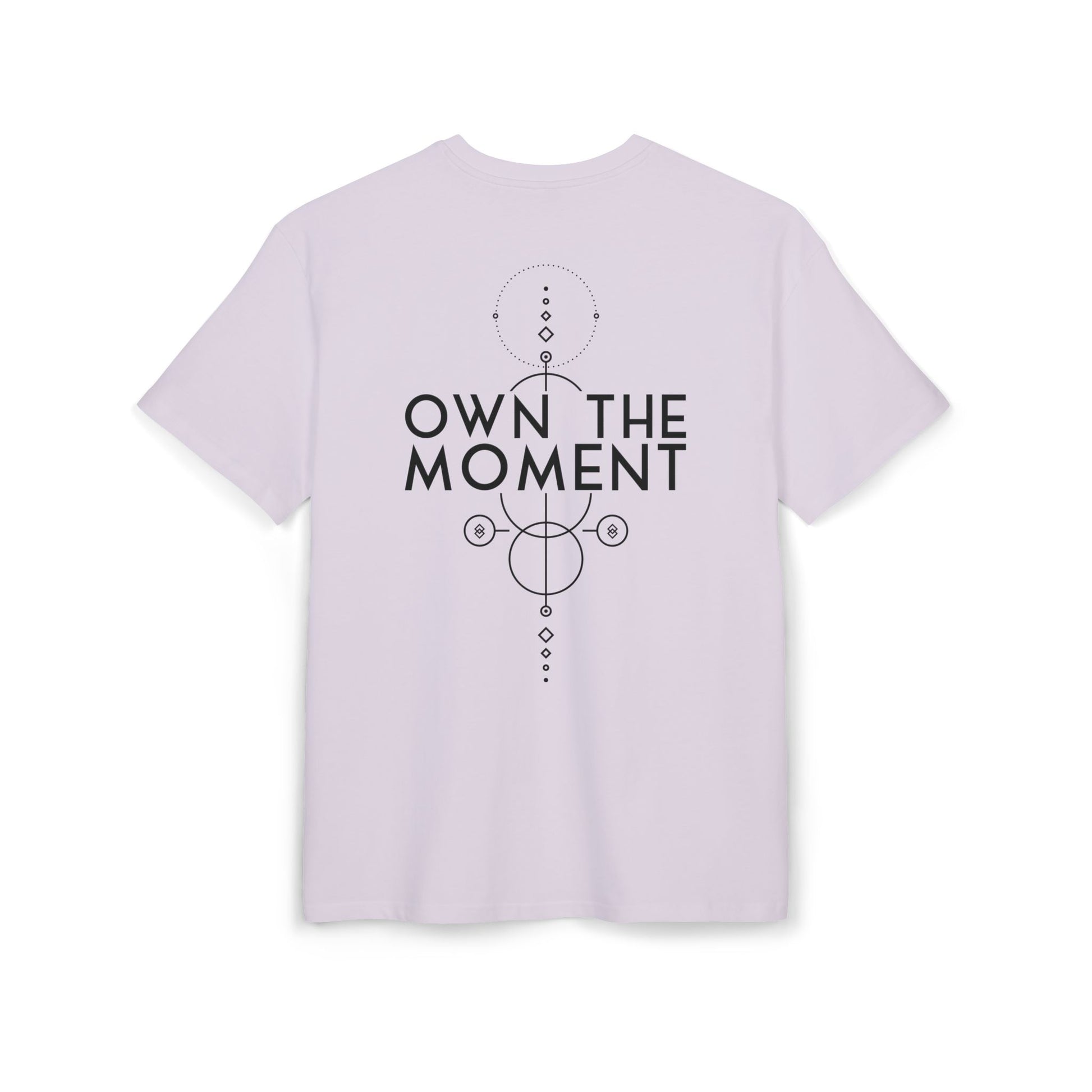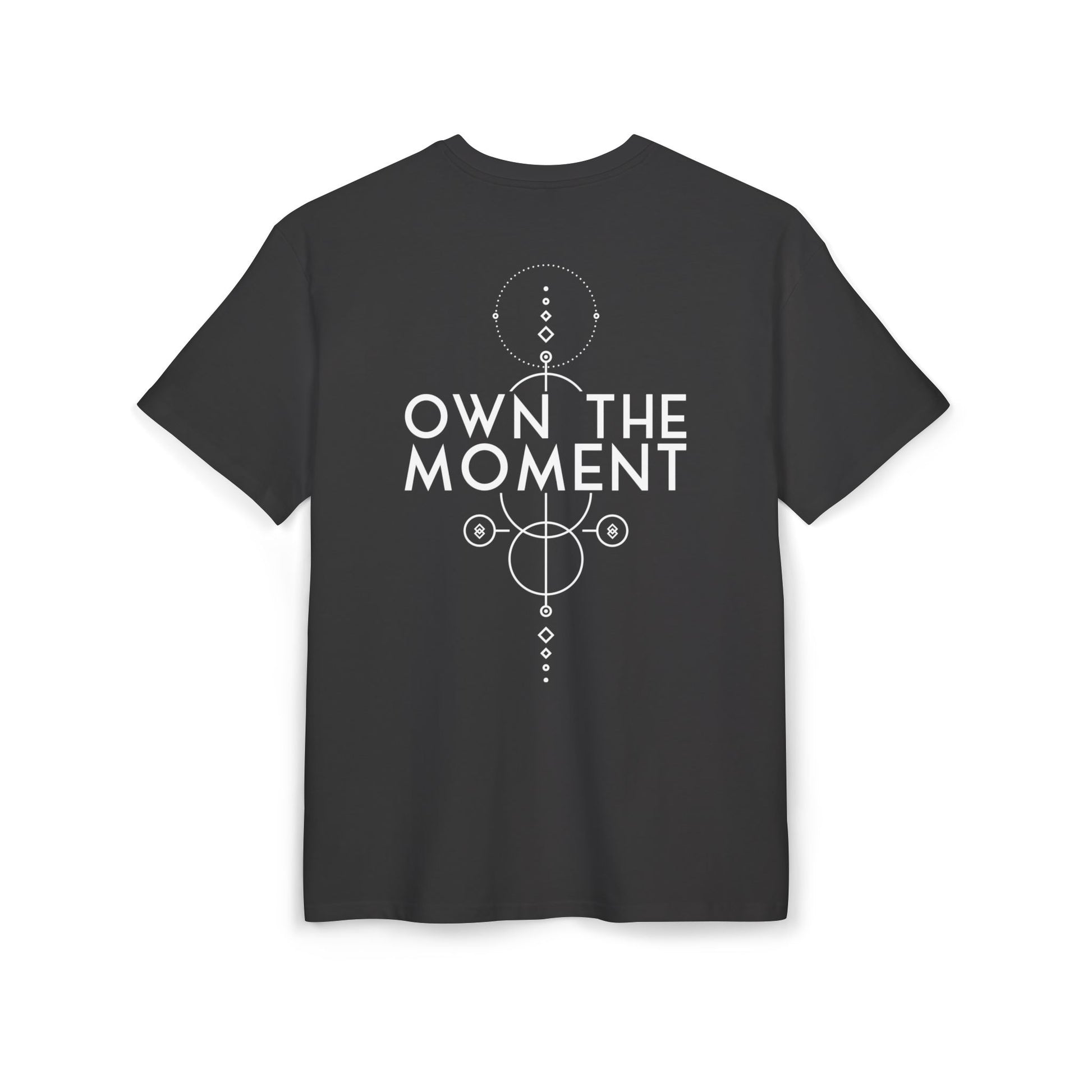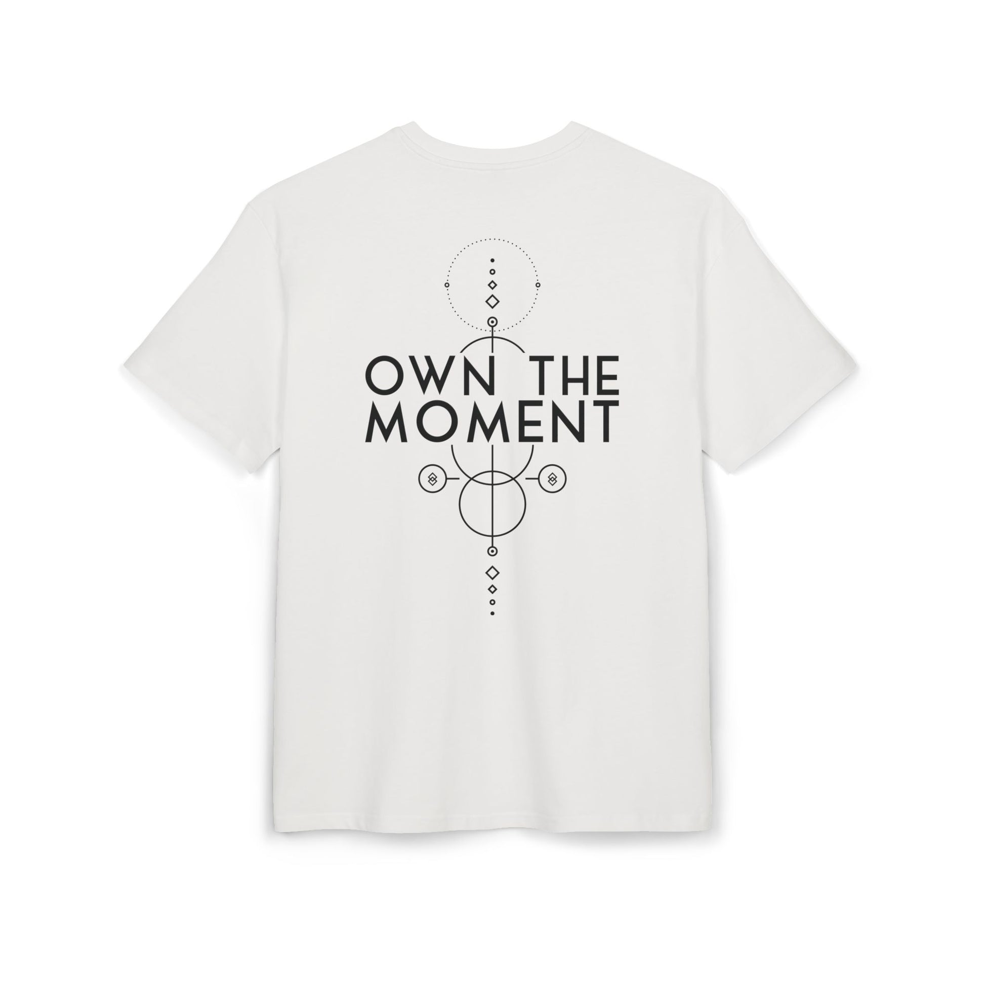 This heavy cotton tee carries a quiet confidence. The wide, dropped-shoulder silhouette drapes like a lived-in favorite, while the minimalist front logo and bold, geometric “OWN THE MOMENT” artwork on the back speak to steady focus and intentional living. It feels grounded — substantial fabric you can feel, clean lines that won’t shout, and a weight that holds its shape through movement. Wear it on slow mornings or long walks; it’s for people who move with purpose and want clothing that reflects that calm determination.